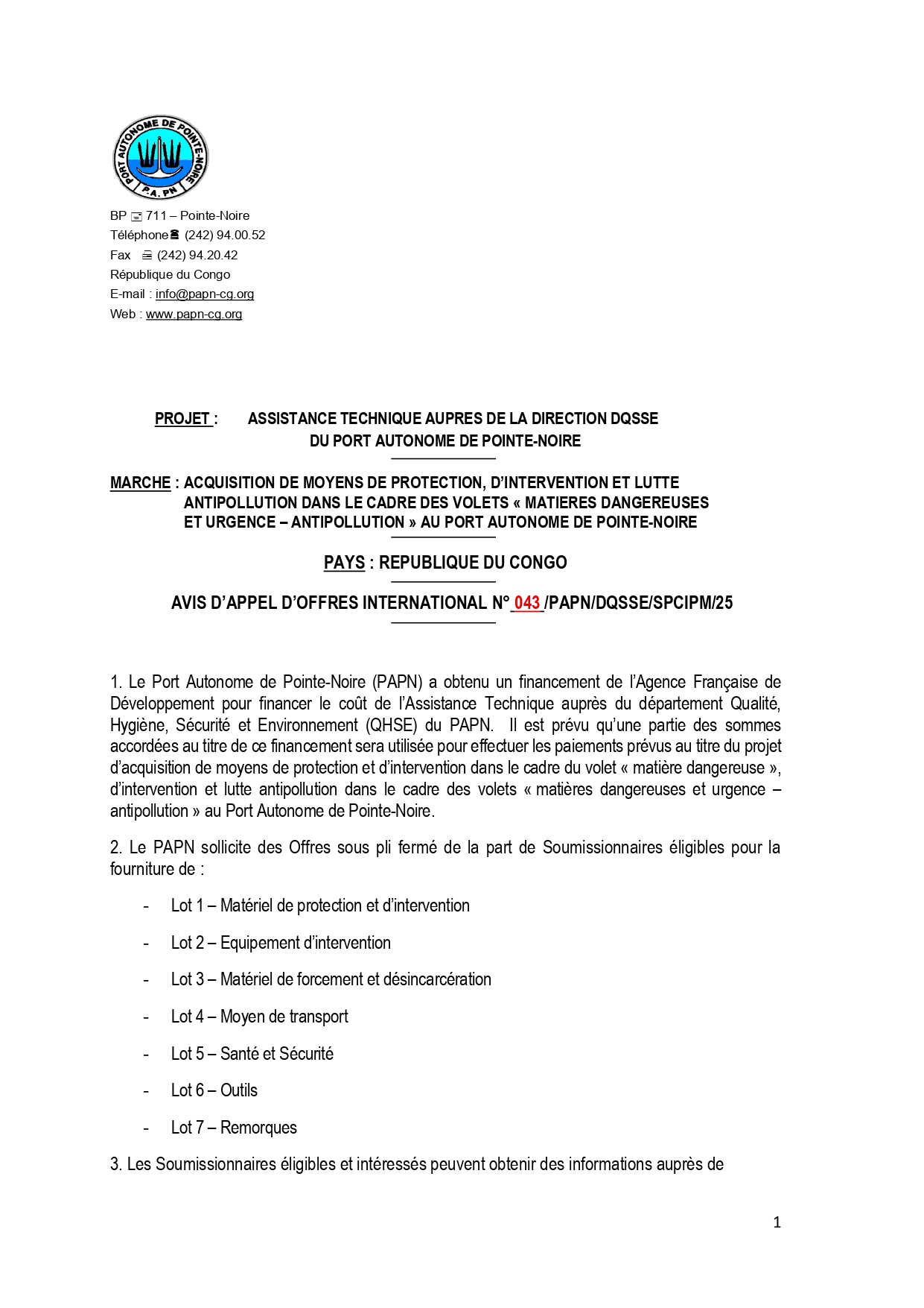 AVIS D’APPEL D’OFFRES INTERNATIONAL POUR LA FOURNITURE DE MOYENS DE PROTECTION, D’INTERVENTION ET LUTTE ANTIPOLLUTION DANS LE CADRE DES VOLETS « MATIERES DANGEREUSES ET URGENCE – ANTIPOLLUTION » AU PORT AUTONOME DE POINTE-NOIRE