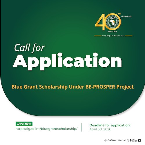 The Blue Grant Scholarship under the Building Blue Economy Resilience and Prosperity in IGAD & Horn of Africa (BE-Prosper) initiative has been established to strengthen regional capacity in Blue Economy leadership, fisheries value chains, coastal governance, marine spatial planning, and sustainable ocean management.