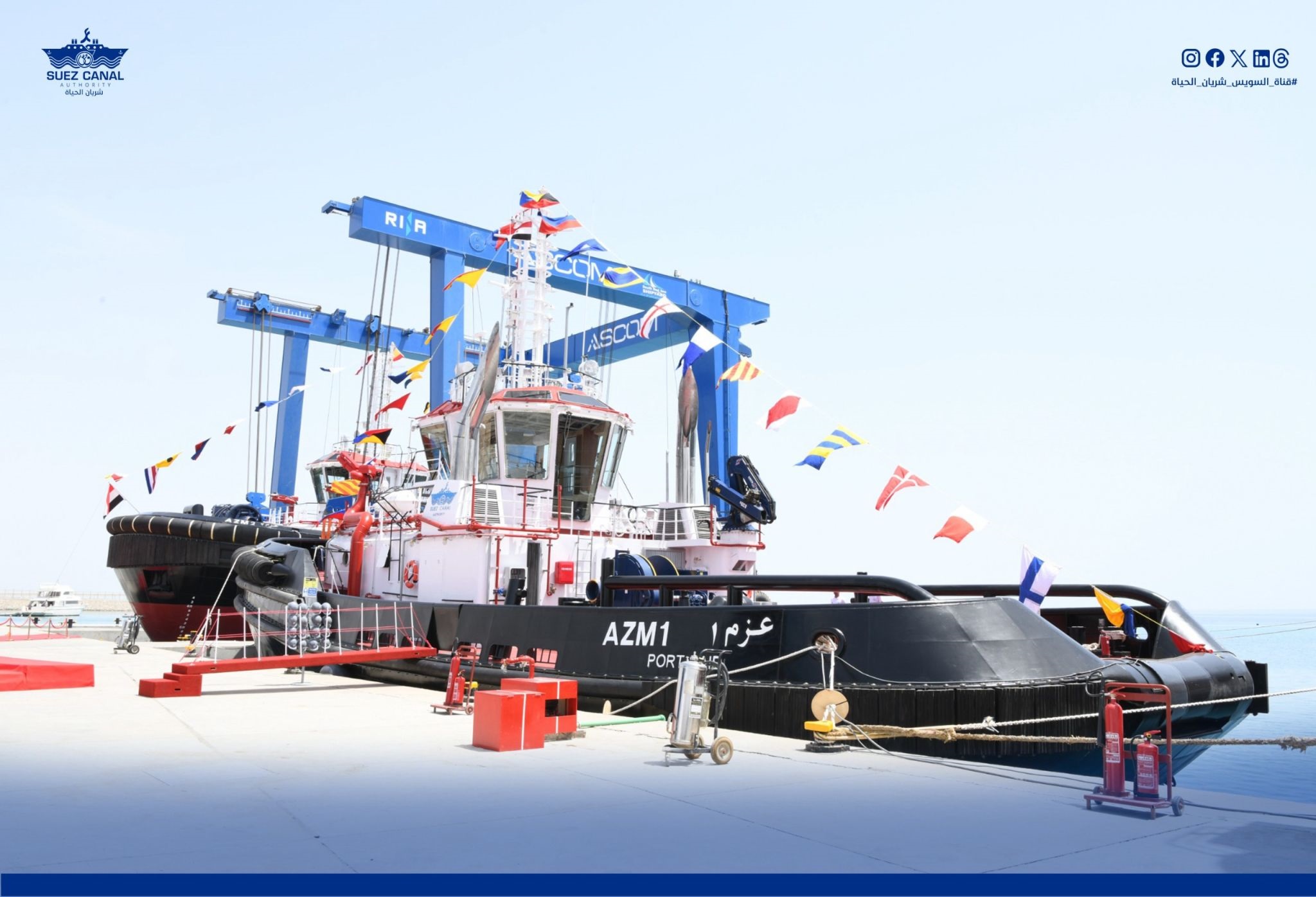 Adm. Ossama Rabiee, Chairman and Managing Director of the Suez Canal Authority, and Mr. Mostafa El-Dougishy, Chairman of the South Red Sea Shipyard, have witnessed today the launching ceremony of the tugboats AZM 1 and AZM 2 at Misr Tugboats Factory in Safaga. These tugboats are the first production of the Factory amongst the primary production line building 10 tugboats for the Suez Canal Authority. The ceremony was attended by H.E. Mr. Bart De Groof, Ambassador of Belgium in Cairo, Rear Admiral/ Ayman Saleh, Vice Chairman of the Red Sea Ports Authority, Rear Admiral/ Ramy Ismail, Commander of the Red Sea Navy Base, and Rear Admiral/Hossam Kotb, Chairman of Alexanderia Shipyard, a number of SCA Board Members as well as the Shipyard’s leadership and personnel.