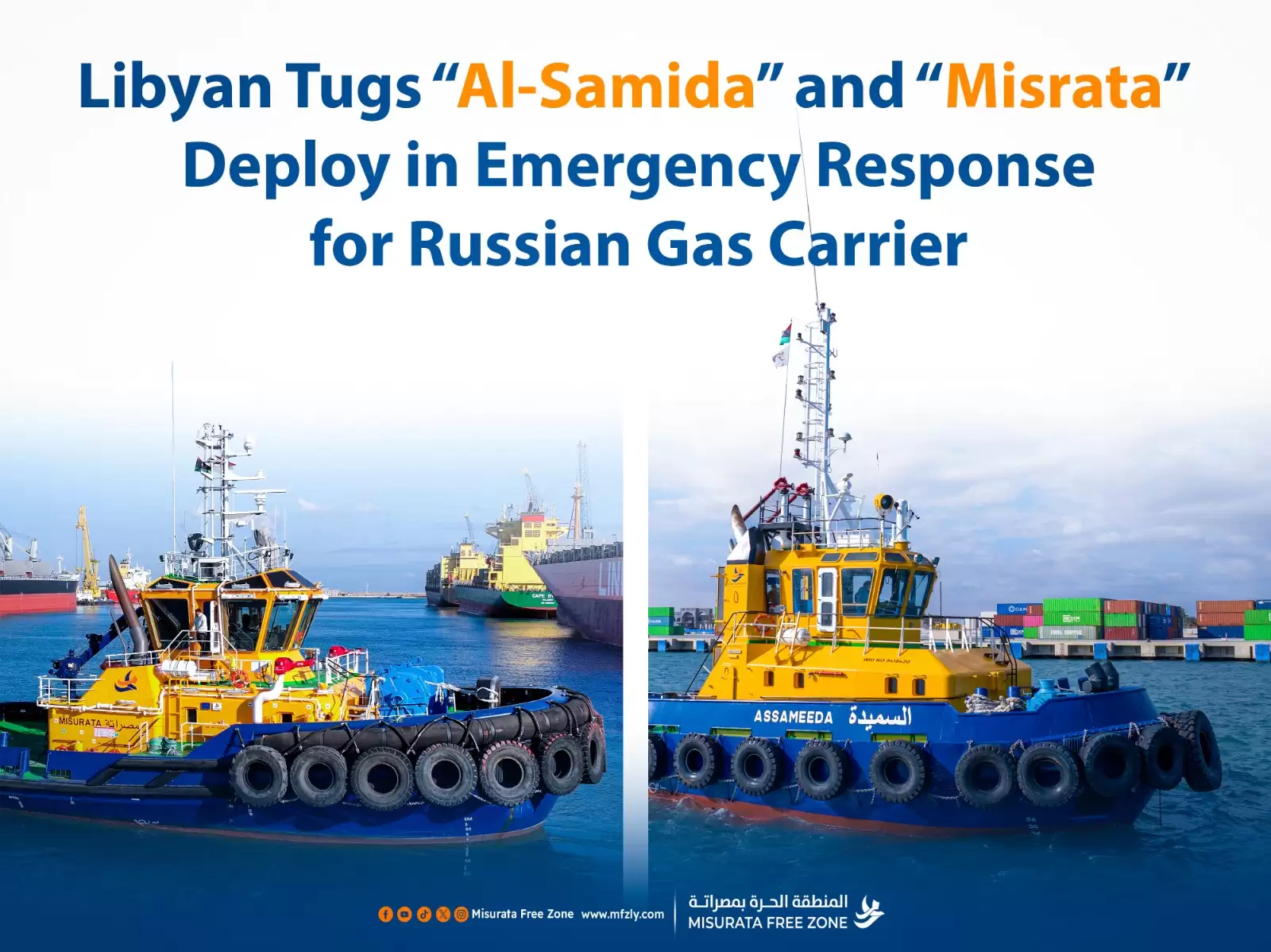 In a demonstration of high operational readiness, the Misurata Free Zone deployed its marine fleet to respond to a maritime incident involving the Russian gas carrier Arctic Metagaz. On March 24, 2026, the tug Al-Samida began operations, followed by the modern tug Misrata on March 25, as part of a coordinated effort within Libya’s territorial waters off the western coast.