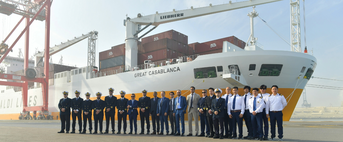 On 4 November, the Grimaldi Group celebrated the inaugural call of its new vessel Great Casablanca in the port she is named after, as part of her route between major ports in Northern Europe and West Africa. The ceremony was attended by distinguished representatives from institutional and maritime authorities, local officials and industry professionals. They included Livio Spadavecchia, Italian Consul General in Casablanca, Sanae El Amrani, Director of Ports and Maritime Public Domain of the Moroccan Ministry of Equipment, Mustapha Farès, Director General of the National Ports Agency (ANP), Andrea Grimaldi, Grimaldi Group Deep Sea Lines Executive Manager, Pasquale Autiero, Master of the Great Casablanca, and Giuseppe PatanèJohn Kenny and Mostafa Benhima, respectively Directors and General Manager of Grimaldi Agencies Maroc.