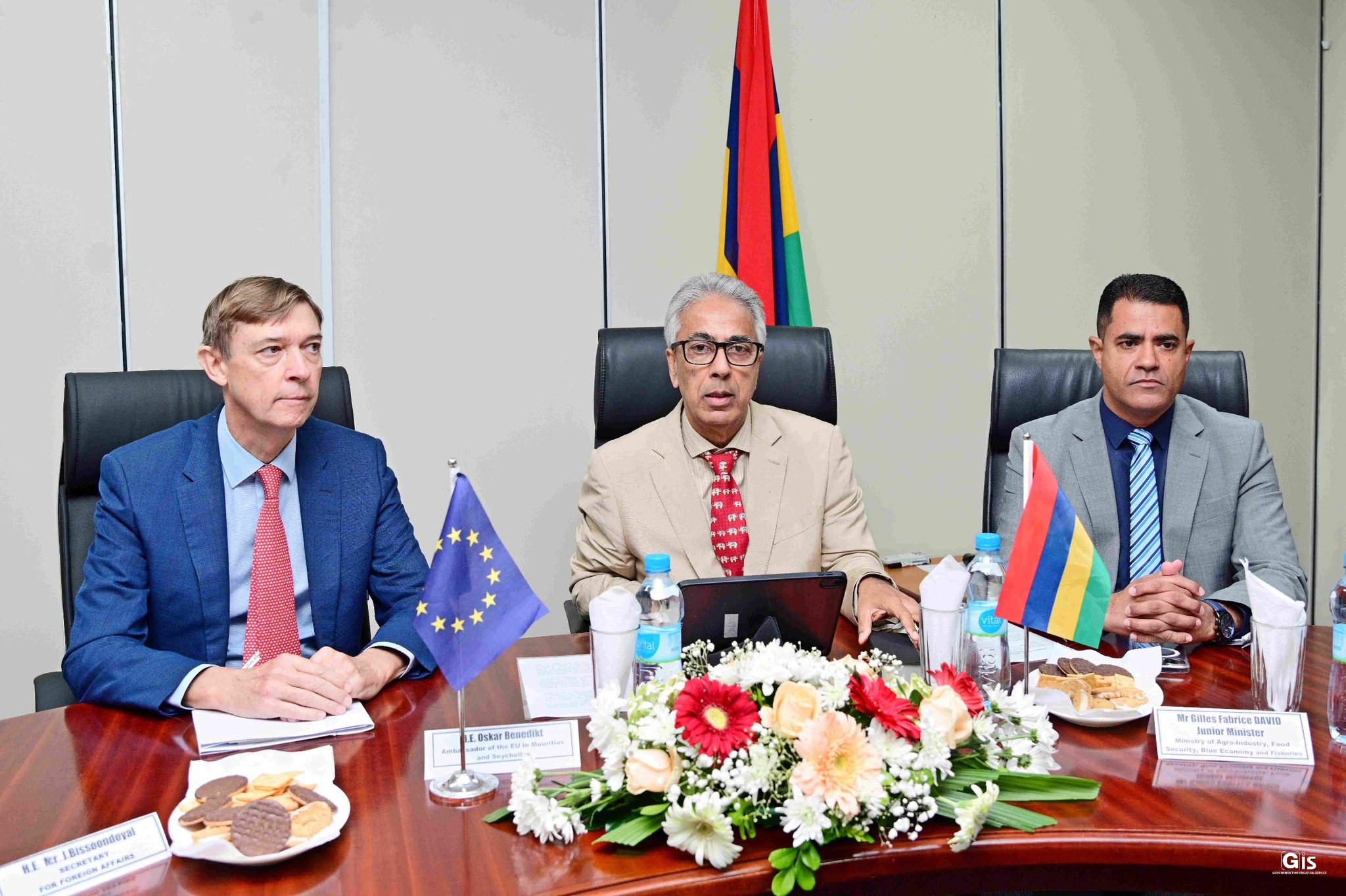 The Minister of Agro-Industry, Food Security, Blue Economy and Fisheries, Dr Arvin Boolell; the Junior Minister, Mr Gilles Fabrice David; the EU Ambassador to Mauritius, Mr Oskar Benedikt; and the EU delegation comprising the Head of Unit at the DG MARE, Mr Roberto Cesari, as well as Ms Pavlina Nikolova, Ms Laura Rull Del Aguila, and Mr Ricardo Carvalho, were present.