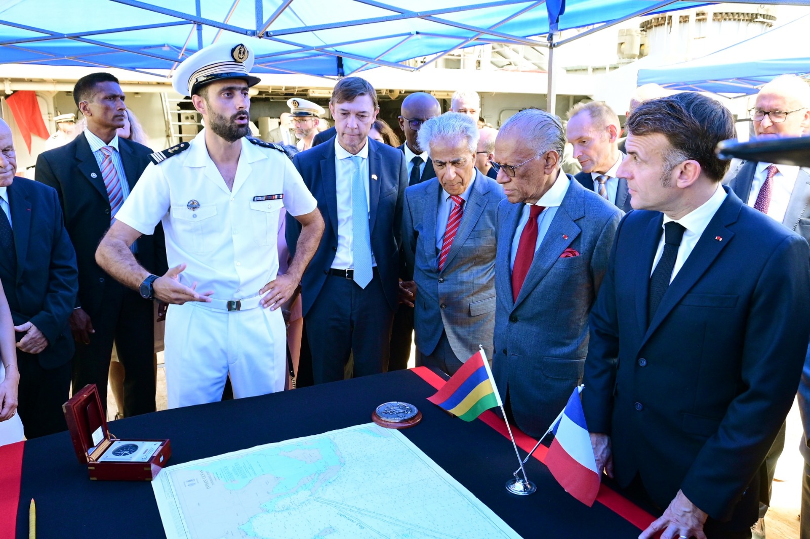 The President of the French Republic, Mr Emmanuel Macron, visited the French Navy patrol vessel ‘Champlain’ this morning. He was accompanied by the Prime Minister, Dr Navinchandra Ramgoolam, at Quay A, Port Louis Harbour, Mer Rouge.