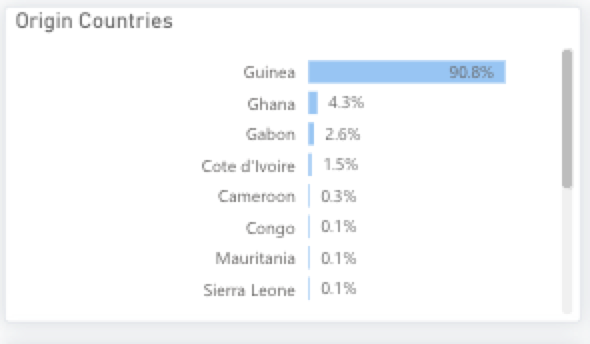 Of all the origin countries in the AAC, Guinea accounts for the largest country of origin, marginally rising from 90% to 91% in the same period as above. Ghana has overtaken Gabon as the second largest source of export of bauxite in the AAC, most likely a result of heavy investment in the bauxite industry by the Ghanaian Bauxite Company in recent years, which has boosted production.