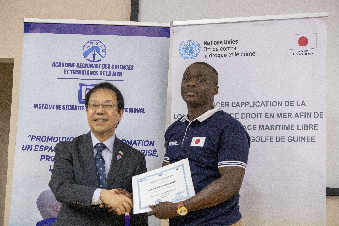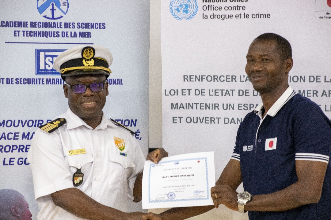 L’Institut de Sécurité Maritime Interrégionale (ISMI) de l’Académie Régionale des Sciences et Techniques de la Mer a abrité la clôture du stage régional sur la connaissance du domaine maritime, marqué par la remise d’équipements informatiques par l’ONUDC grâce à un don du Gouvernement Japonais.