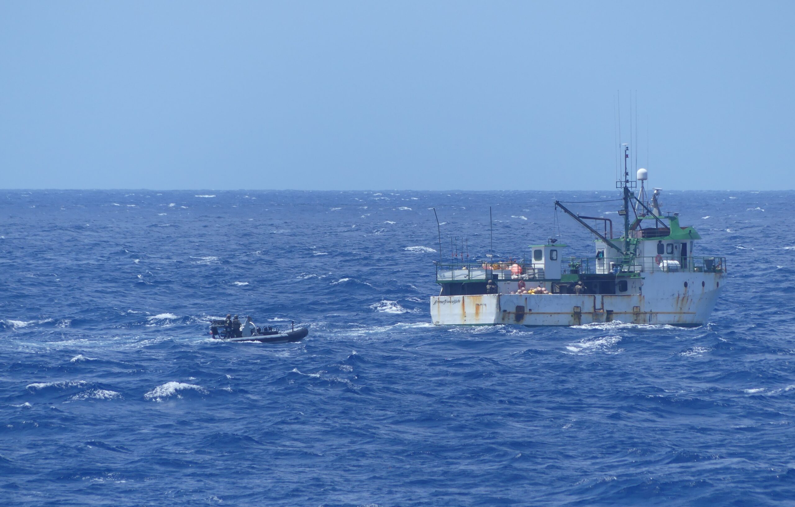 L’équipe de visite de la frégate déployée dans le cadre de la mission Corymbe est intervenue le vendredi 29 août 2025 en haute mer dans la zone maritime Atlantique sur un navire de pêche.