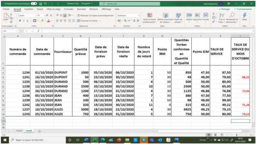 Pour le fournisseur DUPONT on totalise les 2 taux de service et on divise par le nombre de livraisons du mois d’octobre :